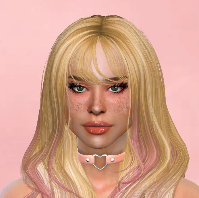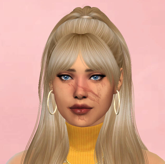psychical description: 5'4", slim but buff, green eyes, waist length wavy blonde hair with pink highlights and bangs, full body freckles, indented scars on right cheek, ears pierced