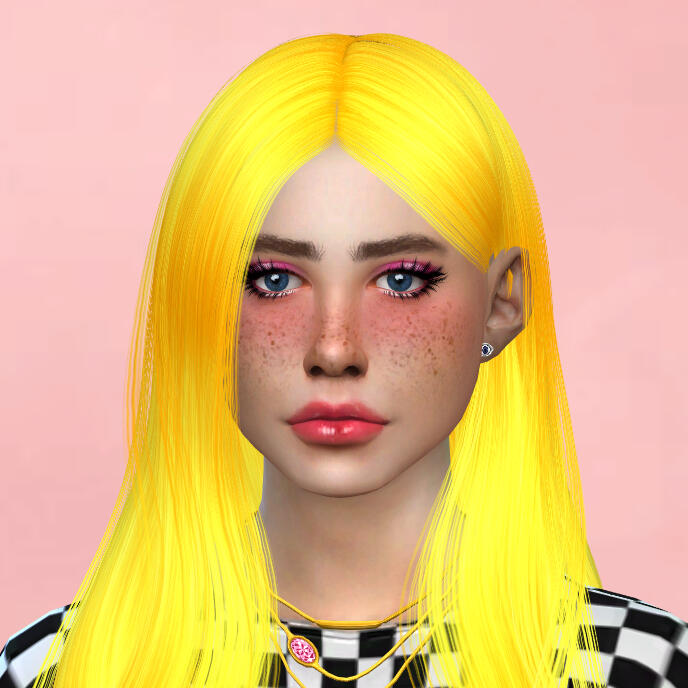 physical description: 9'4", neon yellow hair, freckles across nose and cheels, blue eyes, pale skin
