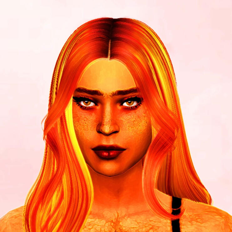 physical description: 5'0", orange eyes, freckles across cheeks and nose, orange/yellow hair that appears to be made of fire, pointed ears, fangs