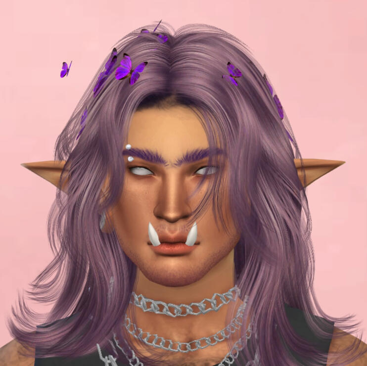 physical description: 5'5", purple hair, large pointed ears, entirely white eyes, large fangs on lower jaw, claw-like nails